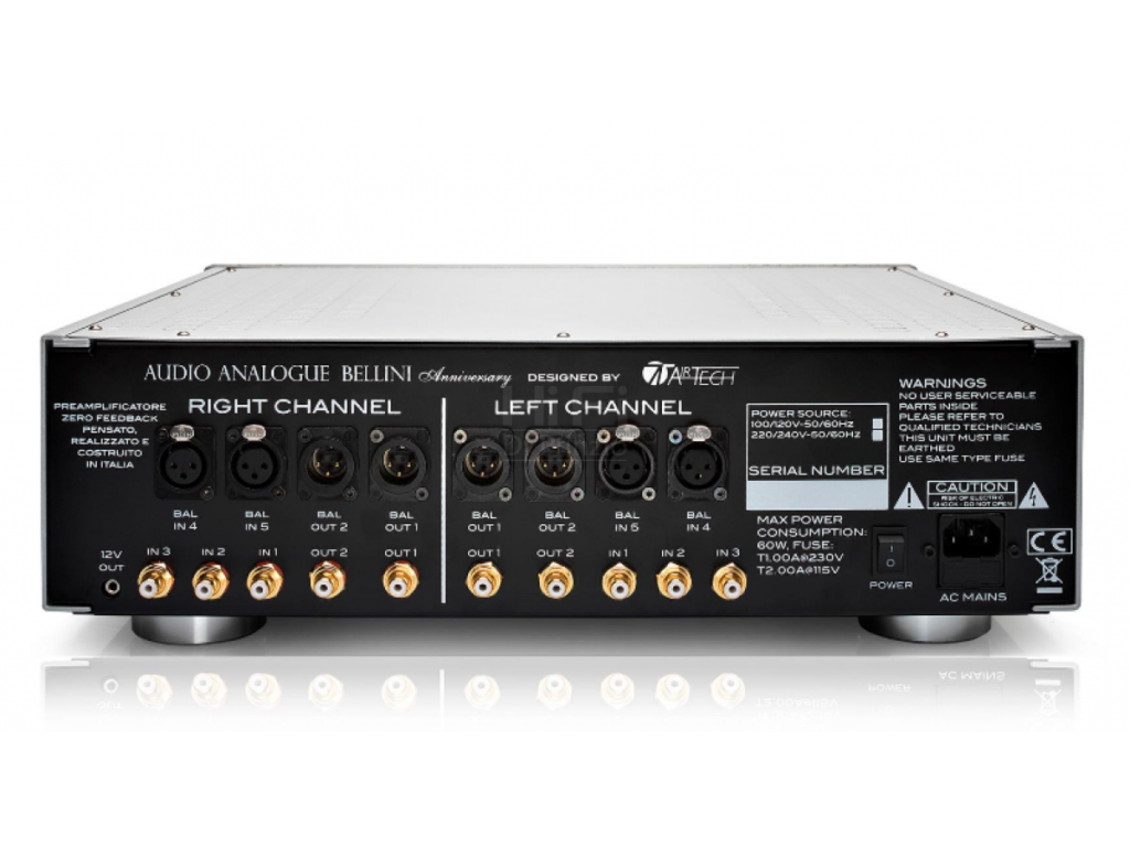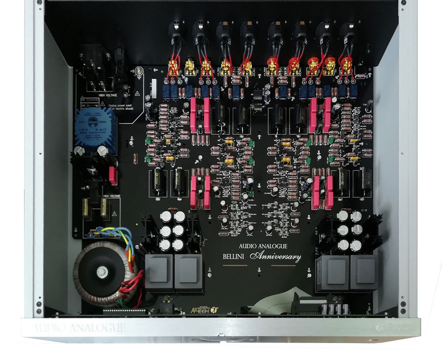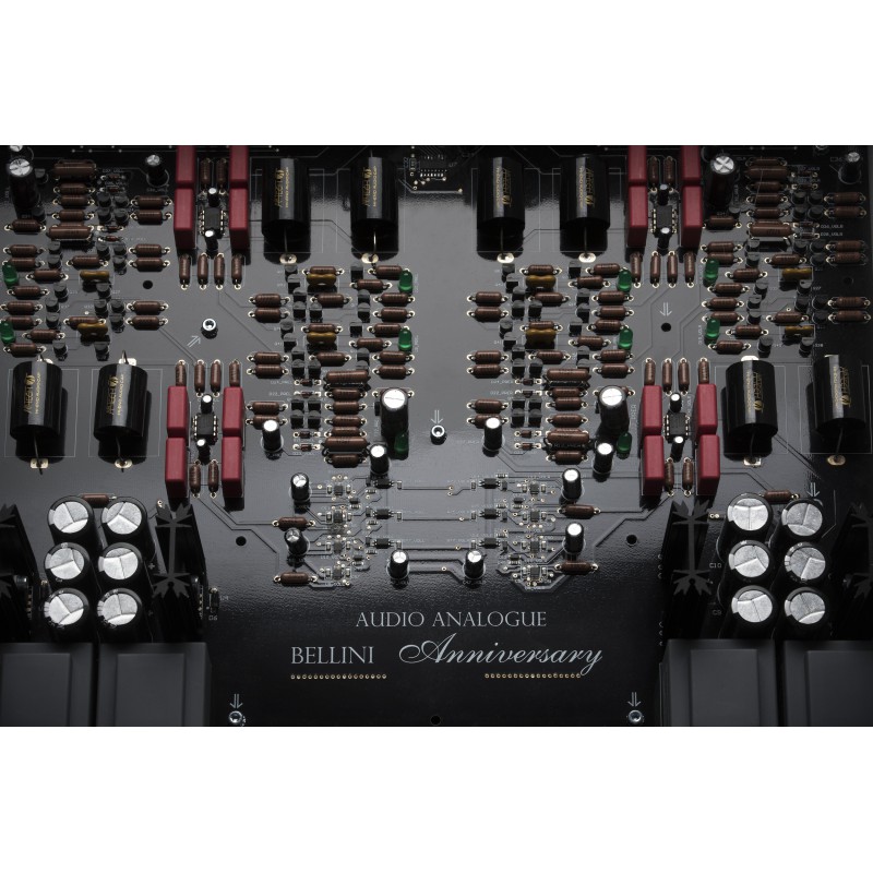 Le préamplificateur Bellini Anniversary, le nouveau né d’Audio Analogue, conçu dans les laboratoires Airtech, fait partie de la gamme Anniversary et propose à nouveau un des produits historiques d’Audio Analogue. La seule chose en commun entre ce nouveau modèle et les versions précédentes de Bellini reste uniquement dans le nom, alors que le projet et les solutions techniques utilisées sont complètement nouveaux. Partant de l’excellente base constituée par la section de pré-amplification de l’amplificateur intégré Maestro Anniversary, les nouveautés par rapport à ce dernier sont toutefois multiples. Le premier est l’étage de l’alimentation qui a été complètement repensé à l’aide d’un filtrage inductif-capacitif afin de minimiser les perturbations de celle-ci. L’inductance du filtre a été conçue et fabriquée spécifiquement pour cet appareil. L’étage d’amplification, appelé SeGeSTA (amplificateur de transconductance d’étape à gain simple), a été conçu pour rendre le préamplificateur encore plus silencieux tout en maintenant la structure complètement équilibrée et sans rétroaction globale. Le circuit comporte 4 couches et le positionnement des composants a été soigneusement étudié pour éviter les croisements entre les signaux d’entrée et de sortie et surtout entre les signaux de commande numériques et les signaux analogiques sensibles. L’utilisation de composants de niveau supérieur et le câblage interne réalisé avec des câbles en cuivre pur 7N OCC complètent le tableau. Bellini Anniversary est disponible dans les finitions argentée et noire et est fourni avec une télécommande en aluminium massif et un cordon d’alimentation Airtech.
