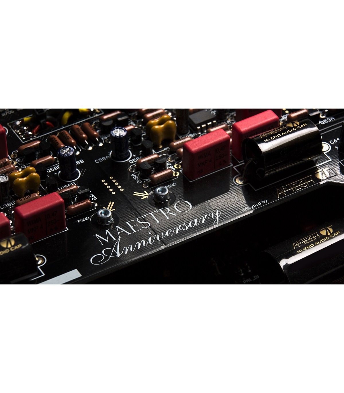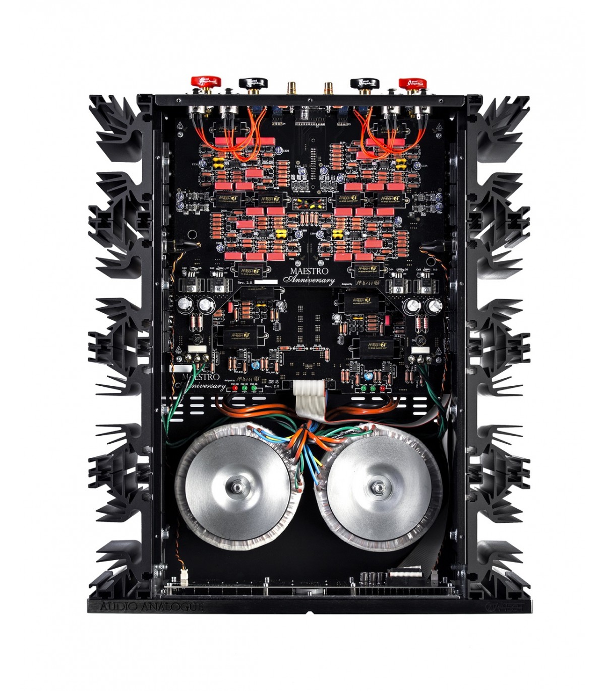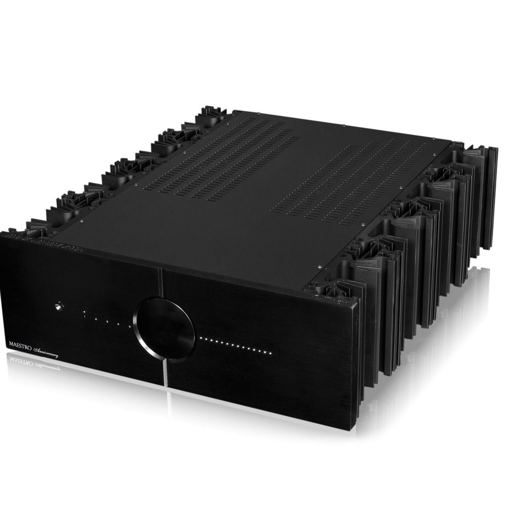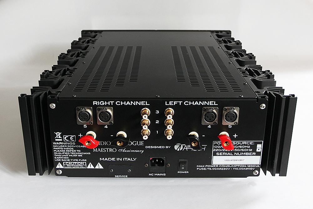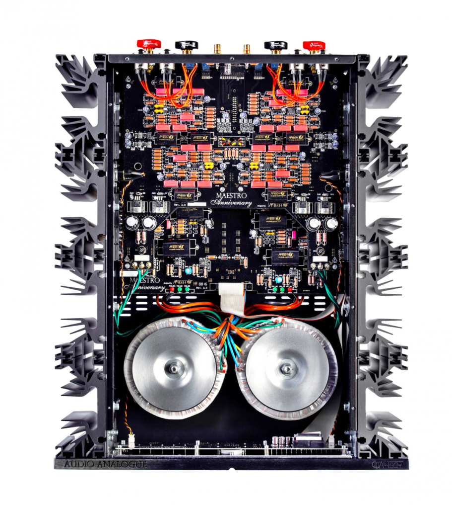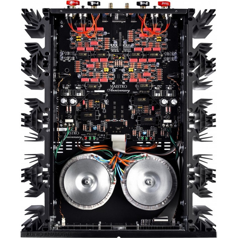 Le Maestro Anniversary a vu le jour dans les laboratoires AIRTECH et découle de l’expérience acquise lors du développement du Puccini Anniversary. Les schémas de base de ces deux modèles sont très similaires, avec cependant une différence significative : le circuit d’amplification du Maestro, totalement symétrique depuis l’étage d’entrée jusqu’à l’étage de puissance, devient asymétrique sur la liaison avec les enceintes. Ceci a conduit à doubler les étages d’amplification et d’atténuation (potentiomètres). De même, tous les étages du Maestro Anniversary ont été conçus sans contre-réaction globale, pas même sur l’étage de pré-amplification (et c’est aussi le cas sur le Puccini). La puissance de sortie a été portée à 150 W sous 8Ω avec, de ce fait, un impact sur le dimensionnement de tous les étages complémentaire et de puissance comportant désormais deux paires de transistors par canal. La configuration de base est une cascode inversée, similaire à un étage unique de gain suivi par un buffer de sortie. La stabilité du point de fonctionnement est assurée par un servo relais à courant continu qui n’intervient qu’aux fréquences inférieures à quelques dizaines de Hz (donc très en deçà du spectre audible). L’amélioration des circuits et le choix de composants de qualité supérieure (résistances aux standards militaires, condensateurs au polypropylène de qualité audiophile conçus pour AIRTECH, câblage interne en cuivre OCC 7N et prises de sortie en cuivre pur) conduit à un amplificateur qui a l’honneur de succéder aux superbes intégrés Maestro. De fait, celui-ci vient compléter la gamme Anniversary célébrant le vingtième anniversaire de l’existence d’Audio Analogue ainsi que les 15 ans de la sortie du tout premier appareil AUDIO ANALOGUE baptisé Maestro. Le nouveau Maestro Anniversary est un amplificateur exclusif, par sa puissance remarquable encore doublée lorsque l’impédance est divisée par deux, et par son extraordinaire aptitude à tenir les charges complexes, cela s’ajoutant à une musicalité et un raffinement extrêmes très peu habituels dans l’univers des amplificateurs « musclés ». Hélas les mots ne suffisent pas pour exprimer tous les atouts et spécificités de cet appareil, c’est pourquoi nous vous invitons à venir l’écouter au plus vite, le seul moyen de vérifier par vous-même et de vous exclamer: «MUSIQUE, MAESTRO !!!»