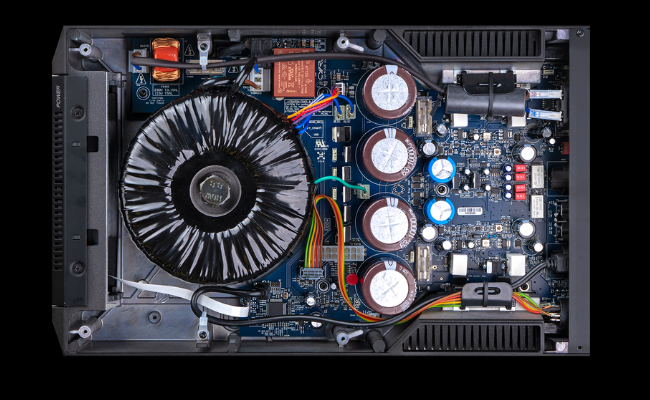 The power supply includes a massive 408VA toroidal power transformer delivering power to a high capacity power supply.