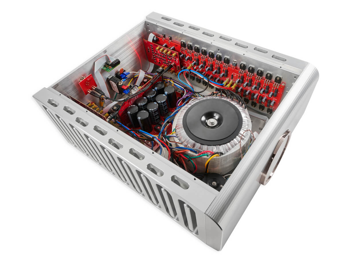Every amplifier employs a voltage rail, actually two, a positive one and its companion negative partner. Voltage rails support the delivery of power to the speaker. The music signal swings between these two rails but due to natural loss, the musical signal never reaches the output rails’ full capability. Our Super Rail overcomes this limitation. Borrowing the idea of a turbo in a car engine, the Super Rail employs higher voltage rails in the sections prior to the output stage. This voltage “boost” allows the musical signal to exploit the full capability of the output voltage rails. Extending the musical signal swing closer to the output rails maximizes the performance of the output circuitry design itself. The result is improved dynamics, lower distortion, and a fierce grip of the speaker.