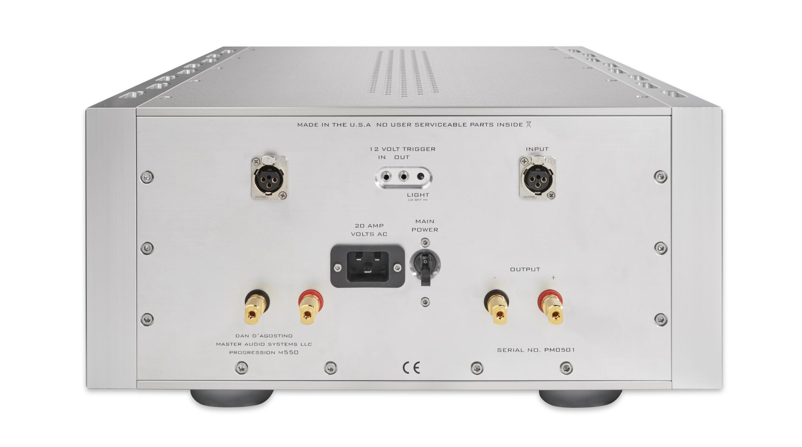 Abundant power is required for realistic sound quality and is a cornerstone of Dan D’Agostino Master Audio Systems’ amplifier design. The Progression Stereo continues this practice. A graceful anodized Aluminum chassis houses a 2,000 VA power supply transformer coupled to nearly 100,000 microfarads of power supply storage capacitance. Paired to this foundation is a fully complementary driver stage, and output circuitry outfitted with 48 power transistors – 24 each for the left and right channels generating an imposing output. Initially used in the Relentless Mono, the output power device provides the foundation for an upgraded output stage. This transistor extends high frequency response, increases power handling 50%, and features tighter tolerance gain matching between complementary NPN/PNP pairs. A wider safe operating area and superior gain linearity provides greater thermal stability throughout the amplifiers’ power delivery. Coupling the new output device to the high efficiency heat sink design affords an increase in operating bias. Higher operating bias lowers crossover distortion improving instrument timbre and tonal reproduction. The Progression Stereo delivers 350 Watts into 8 Ohms and delivers 700 Watts into 4 Ohms, and properly doubles its output again into 2 Ohms, with a 1,400 Watt power output. The essence of live music, dynamic contrasts, are faithfully reproduced with leading edge transients spectacularly depicted.