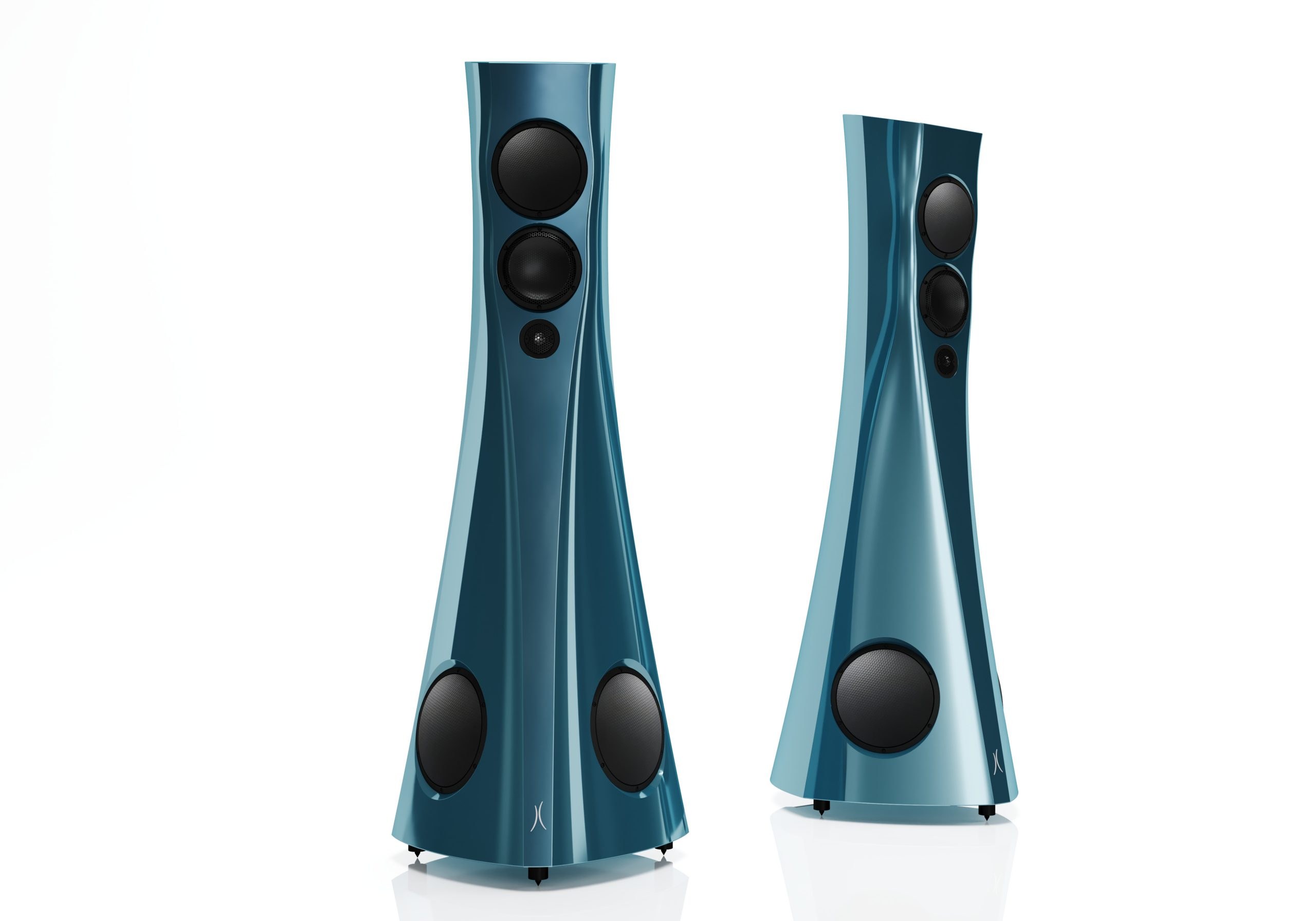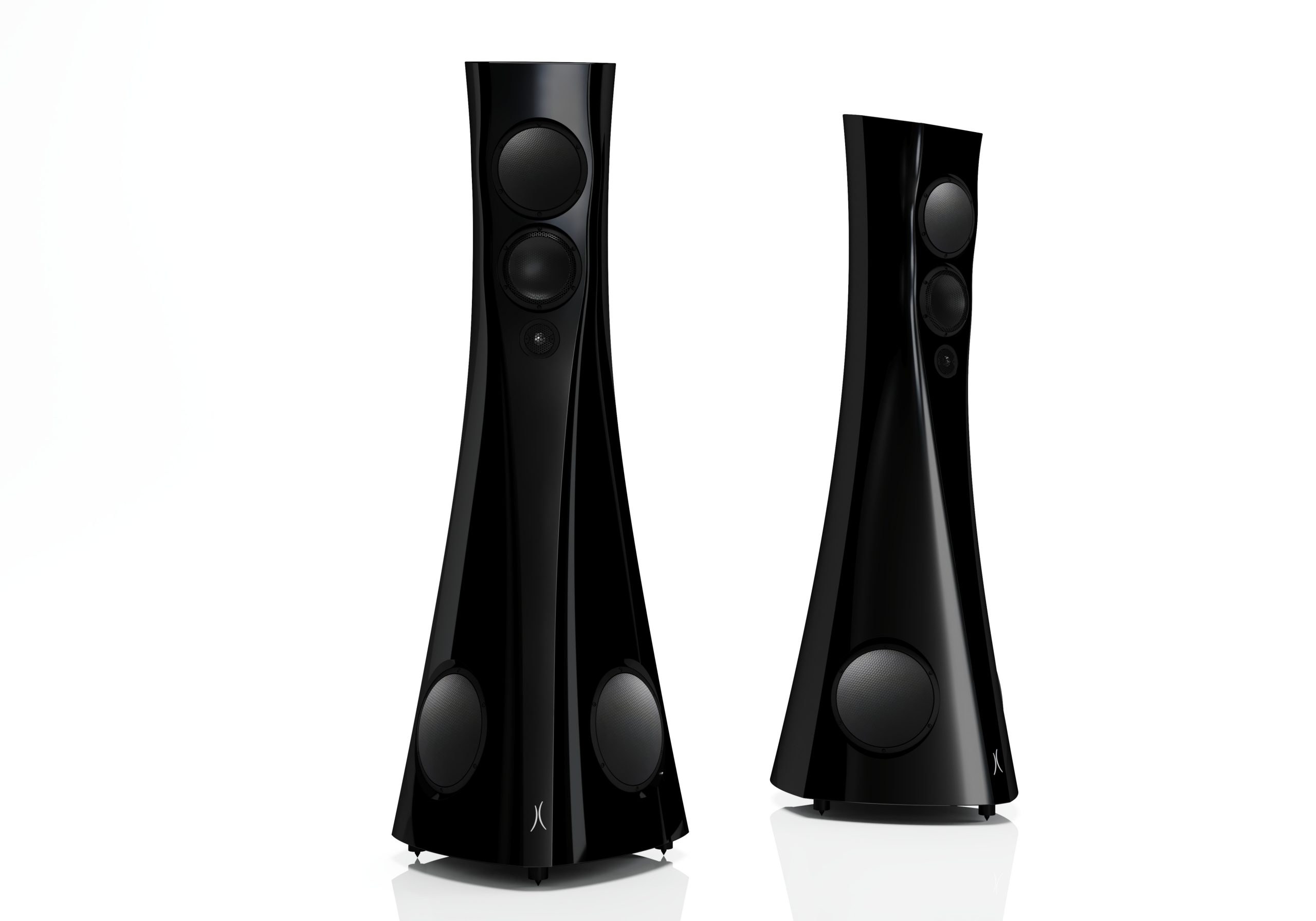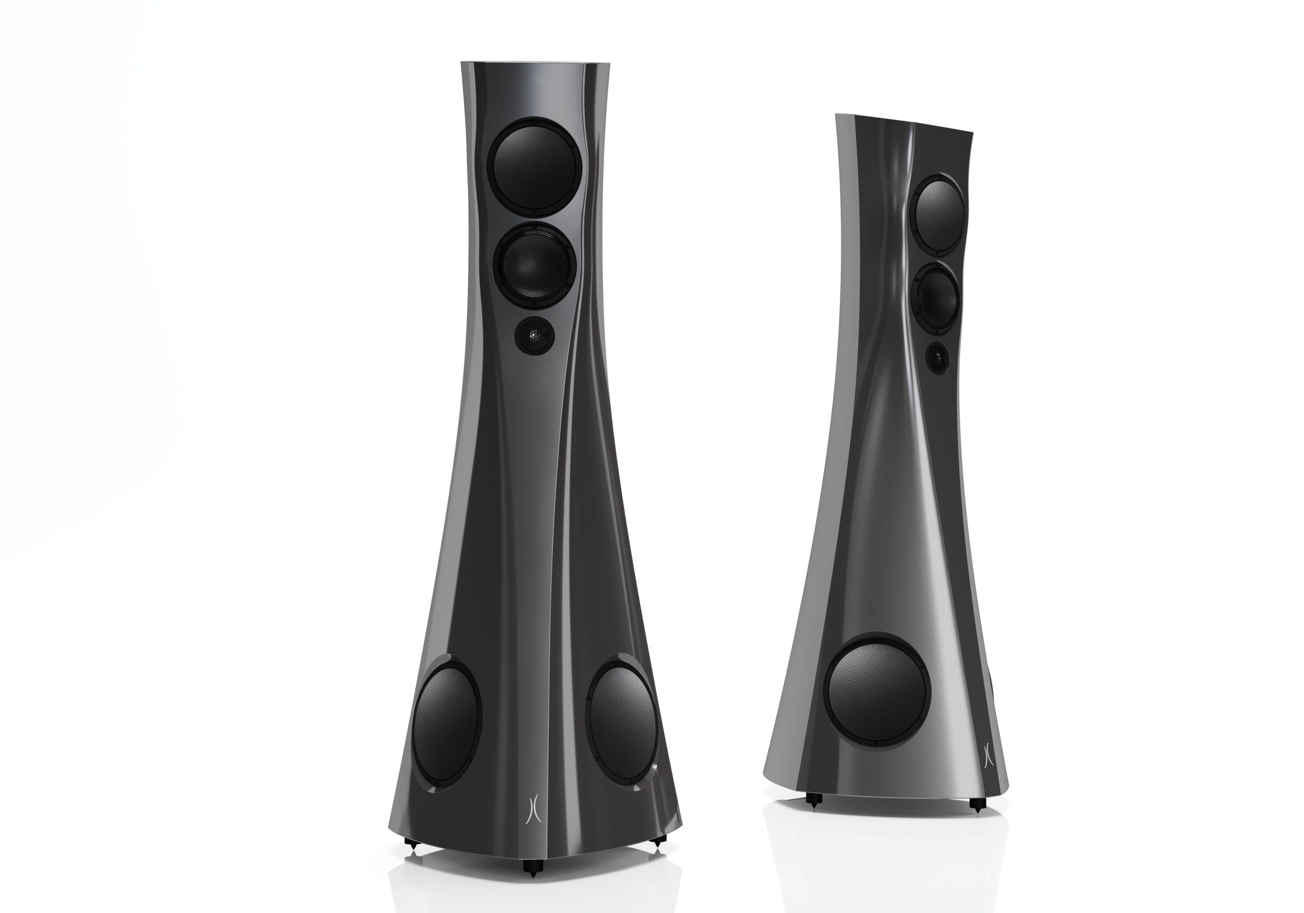 The three upper drivers are positioned on the curved front panel in a way that from the listening position these are approximately at the same distance from the listener. This, combined with the meticulously fine-tuned cross-over filters, means that the sound from each driver reaches the listening position at the same time, resulting in a coherent, precise sound signal with uncompressed dynamics, perfect tonal balance, very precise imaging, and lifelike sound-staging.