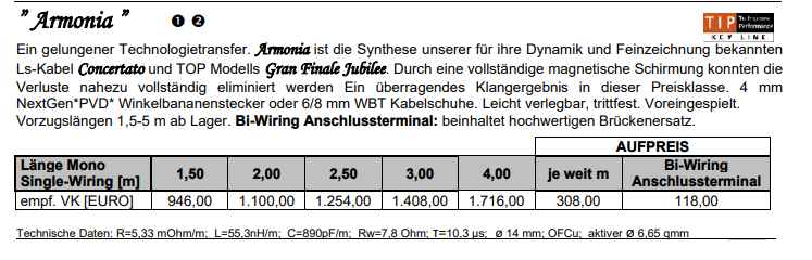 Ein gelungener Technologietransfer. Armonia ist die Synthese unserer für ihre Dynamik und Feinzeichnung bekanntenLs-Kabel Concertato und TOP Modells Gran Finale Jubilee. Durch eine vollständige magnetische Schirmung konnten dieVerluste nahezu vollständig eliminiert werden Ein überragendes Klangergebnis in dieser Preisklasse. 4 mmNextGen*PVD* Winkelbananenstecker oder 6/8 mm WBT Kabelschuhe. Leicht verlegbar, trittfest. Voreingespielt.