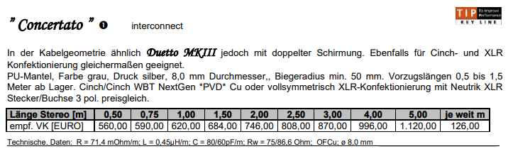 In der Kabelgeometrie ähnlich Duetto MKIII jedoch mit doppelter Schirmung. Ebenfalls für Cinch- und XLRKonfektionierung gleichermaßen geeignet.