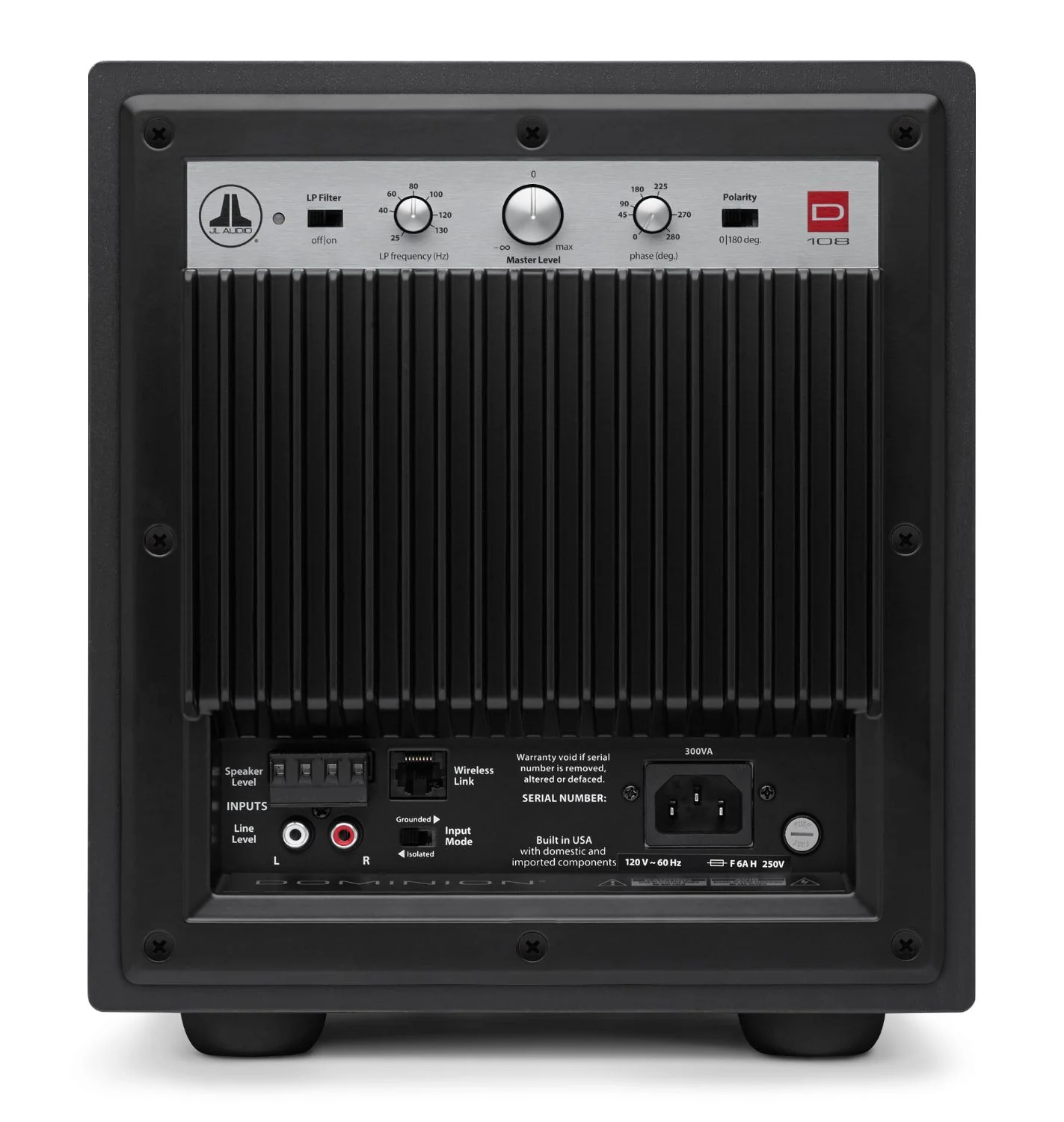 With a host of signal processing features included, Dominion® powered subwoofers can be integrated into most systems with ease. Low-pass signals are precisely guided, thanks to the onboard crossover’s 24 dB/octave Linkwitz-Riley alignment. Phase and polarity controls are onboard to aid in achieving the optimal acoustic transition between the subwoofer(s) and main speakers. Flexible input options are on-hand to accept either line-level or speaker-level signals. Connect a JLINK™ TRX system (sold separately) to the onboard Wireless Link port and enjoy the freedom to position your Dominion® almost anywhere, up to 100 feet (30 meters) away from your source unit.