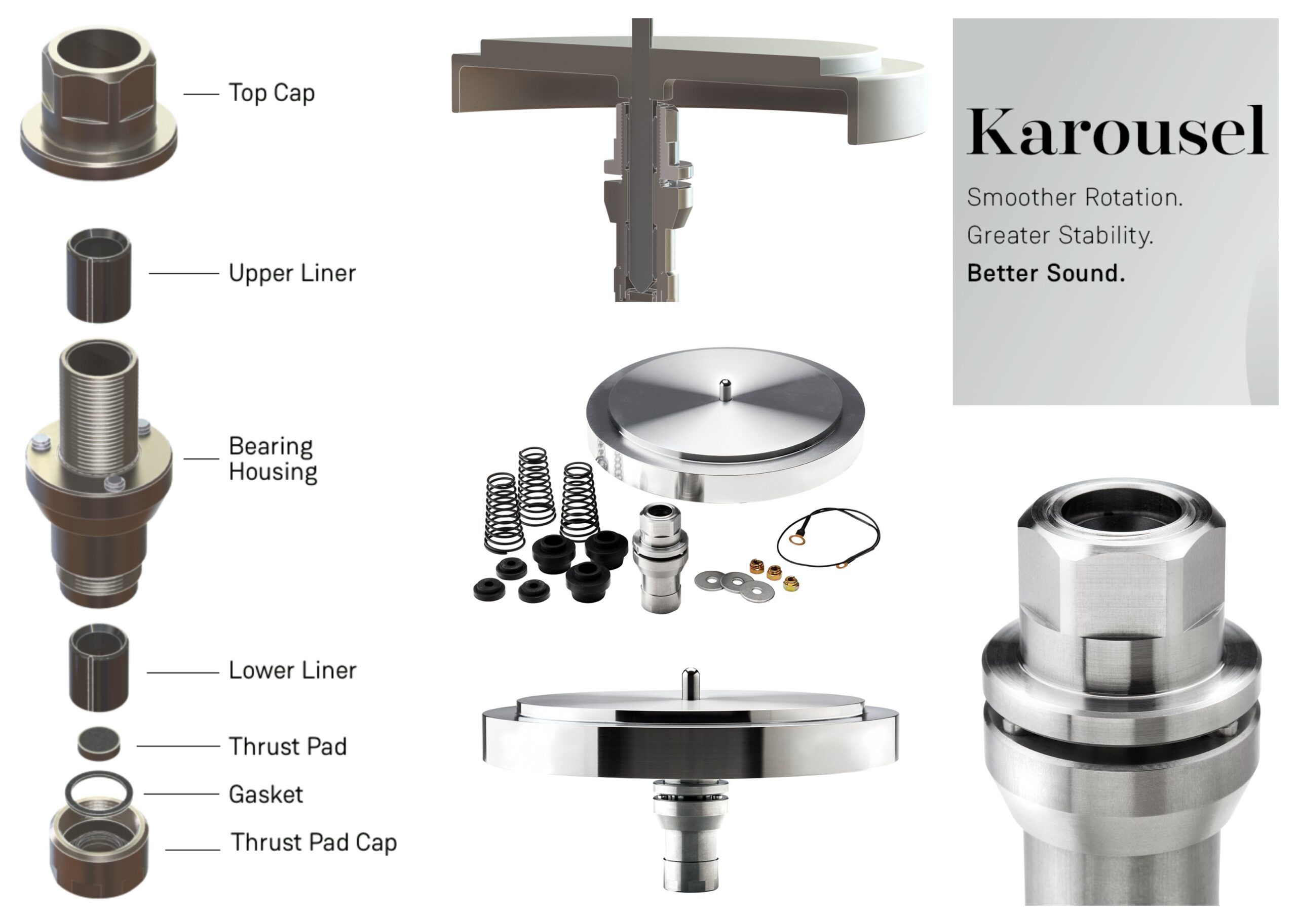 LINN a récemment introduit le KAROUSEL, nouvel axe, qui améliore considérablement la rotation et donc influence positivement la qualité sonore. Ce KAROUSEL BEARING est évidemment disponible en “upgrade” pour tout client possédant une LP, pour tous les modèles depuis 1972 jusqu’à à nos jours.