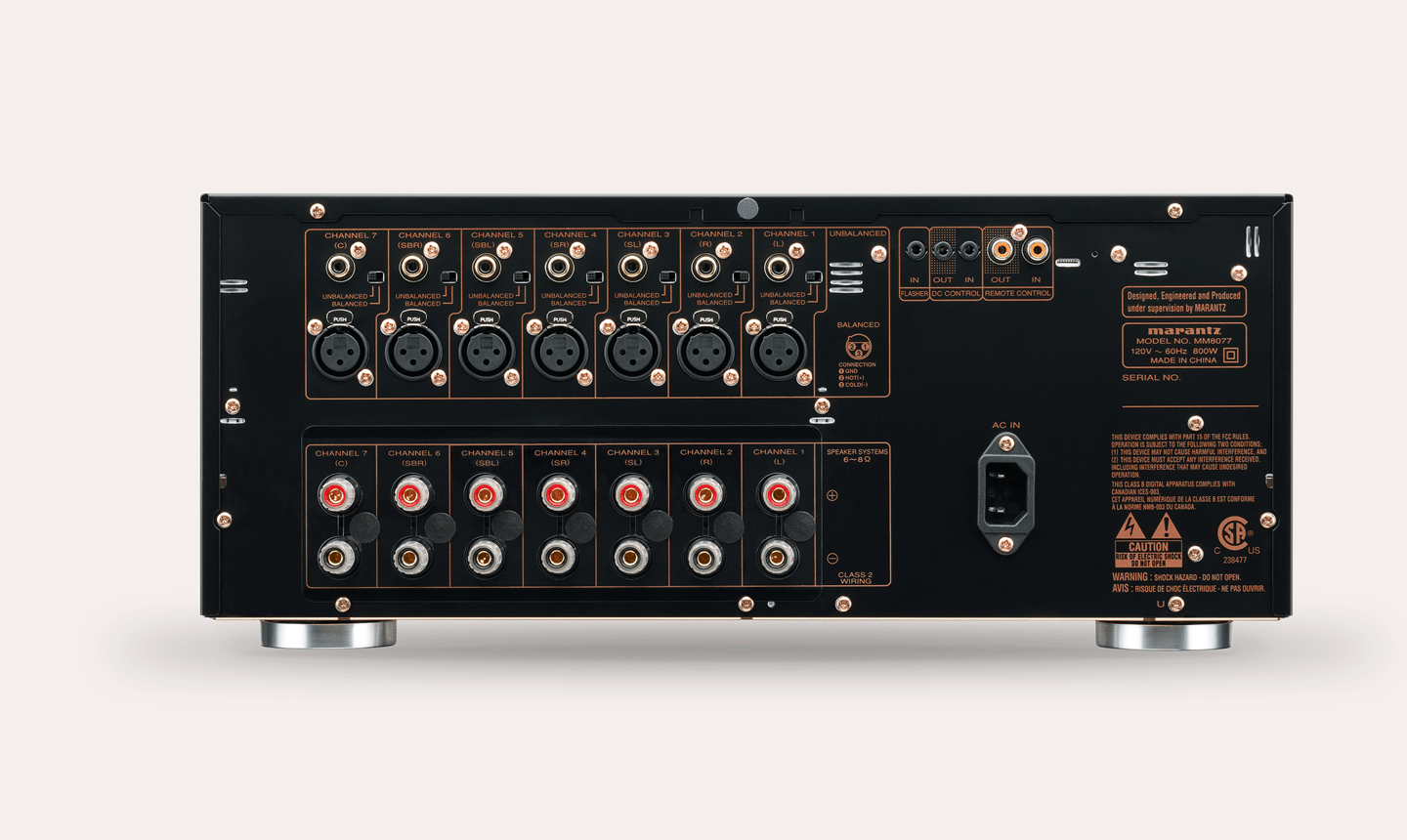 Le MM8077 à 7 canaux premium est conçu de manière experte pour répondre à vos besoins de puissance élevée avec 150W par canal. L’ensemble de l’unité est conçu pour alimenter les enceintes de manière contrôlée et précise afin de fournir les meilleurs signaux audio. Le châssis plaqué cuivre et l’alimentation électrique par transformateur toroïdal soulignent cette volonté.