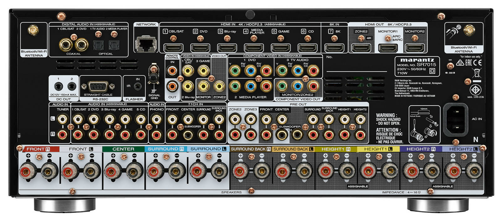 Le nouveau Marantz SR7015 inclut 8 entrées HDMI et 3 sorties pour toutes vos sources préférées. Une entrée HDMI 8K dédiée prend en charge le pass-through 8K/60Hz et 4K/120 Hz, le sous-échantillonnage Pure Color 4:4:4, Dolby Vision, HLG, HDR10, le pass-through vidéo 21:9, 3D et BT.2020.