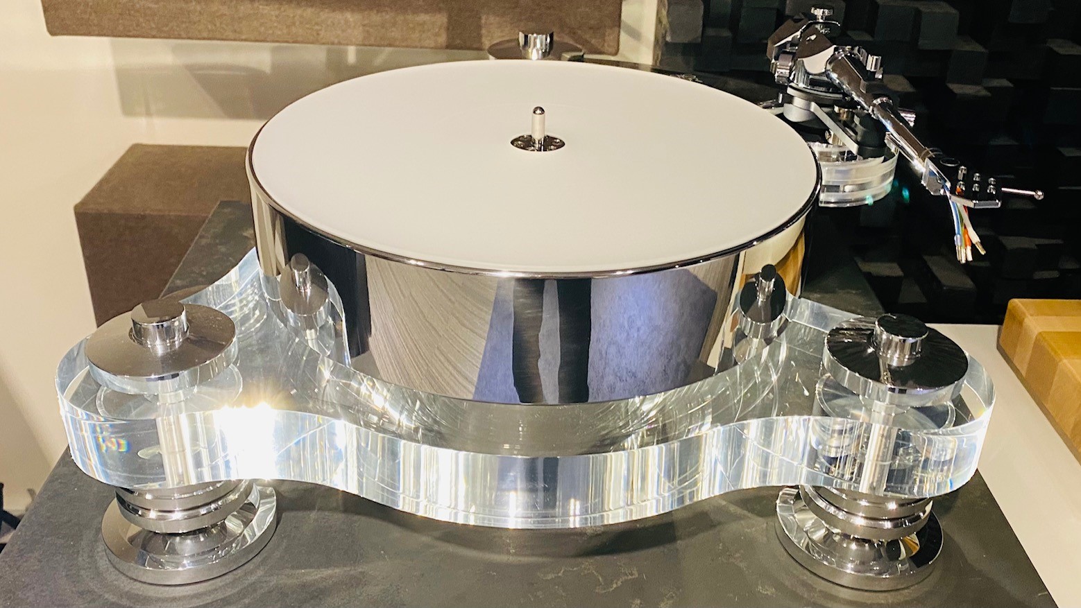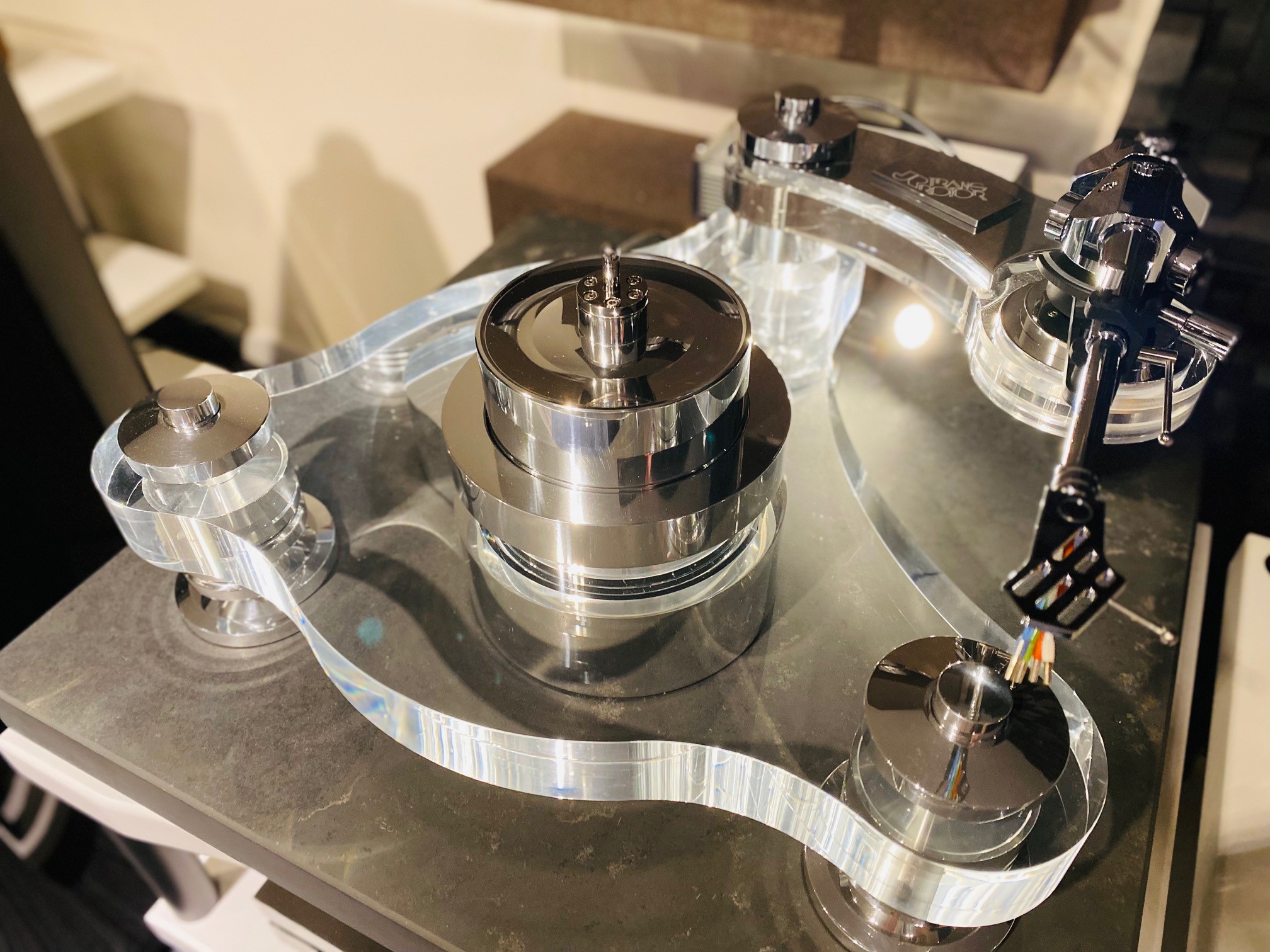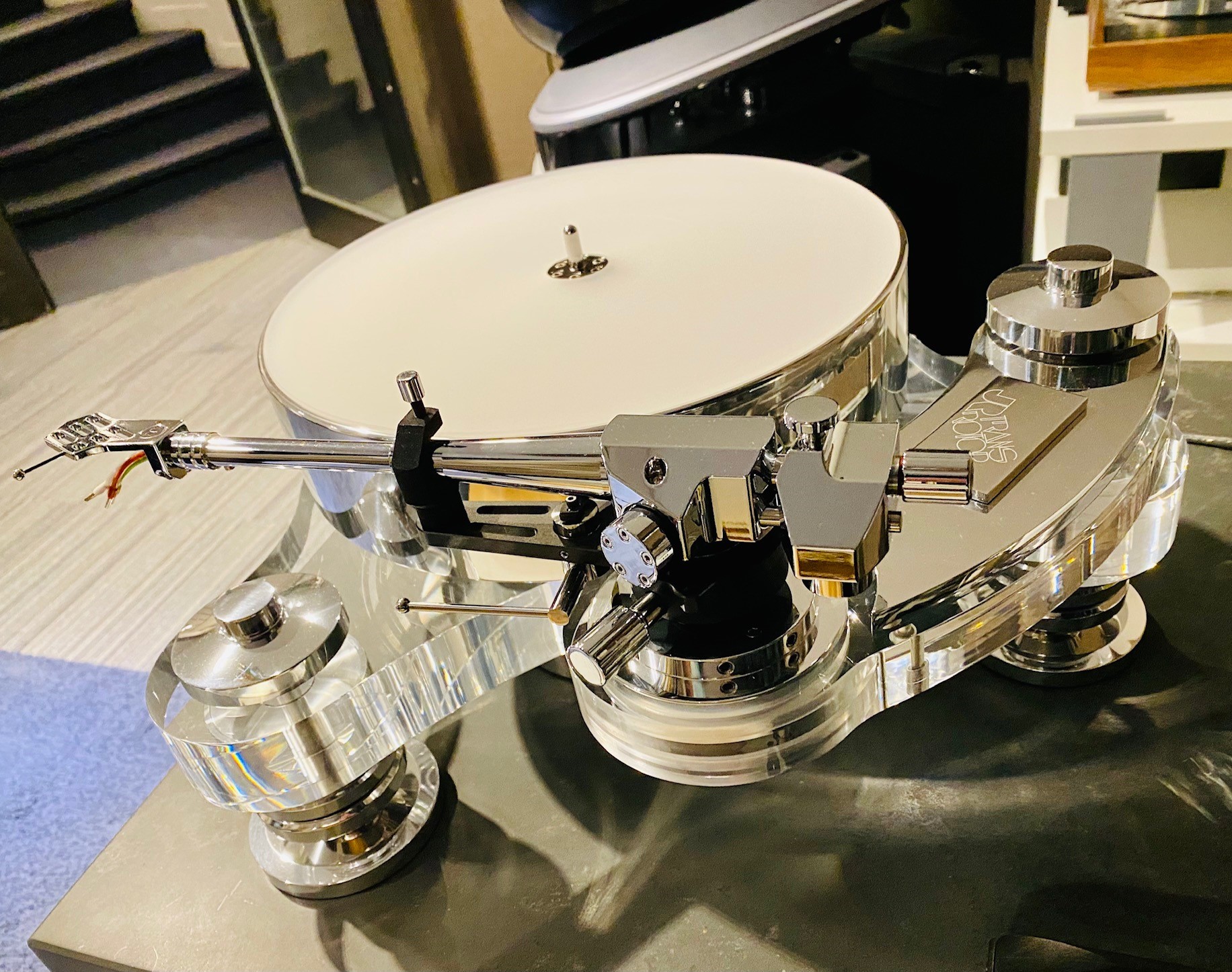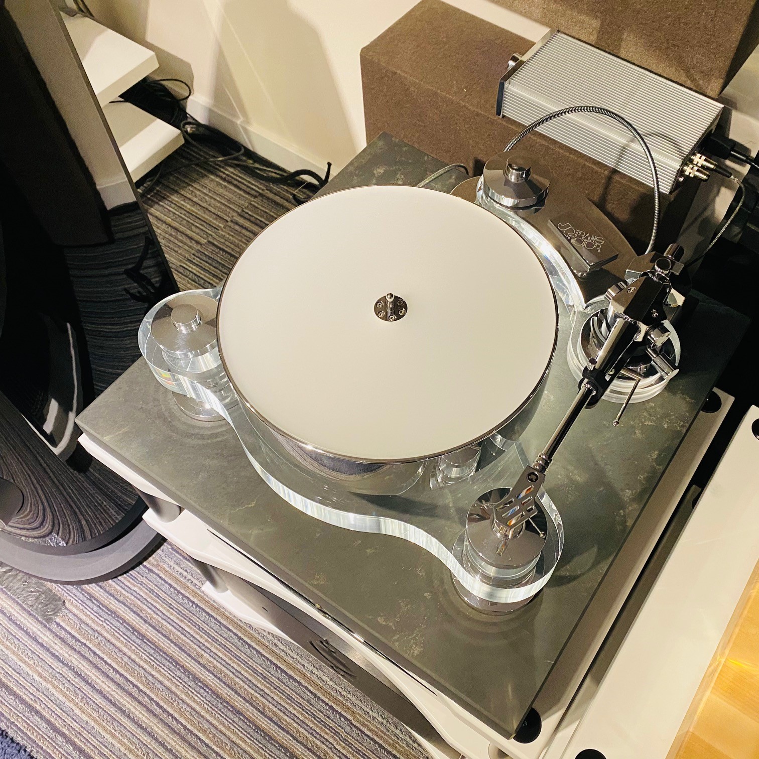 Notre modèle d’exposition est équipé du tout nouveau bras TRANSROTOR TRA 9, un bijou entièrement conçu et fabriqué par Jochen Räke et son équipe.